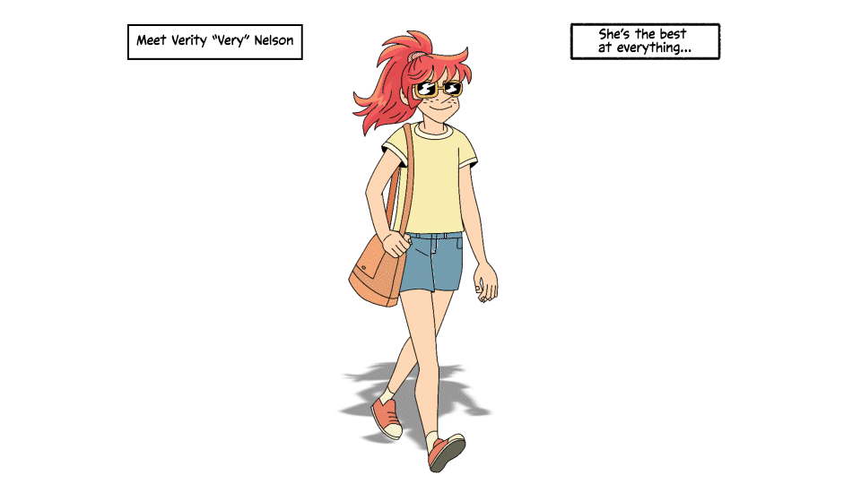 I had to create a walk cycle of Very Bad At Math’s main character Verity “Very” Nelson. So, I started with original artwork from the author/illustrator Hope Larson…